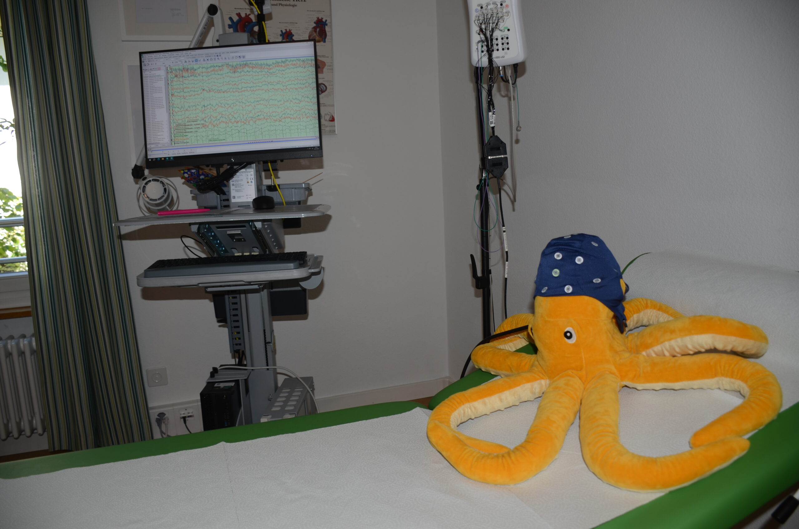 Bei der Untersuchung werden EEG-Elektroden am Kopf der Patient:in befestigt. In unserer Praxis verwenden wir dazu für Kinder und Erwachsene Kappen, ähnlich einer Badekappe, welche die Patient:innen anziehen. Das Haar sollte frisch gewaschen, aber ohne Rückstände von Haarspray oder Haargel sein.